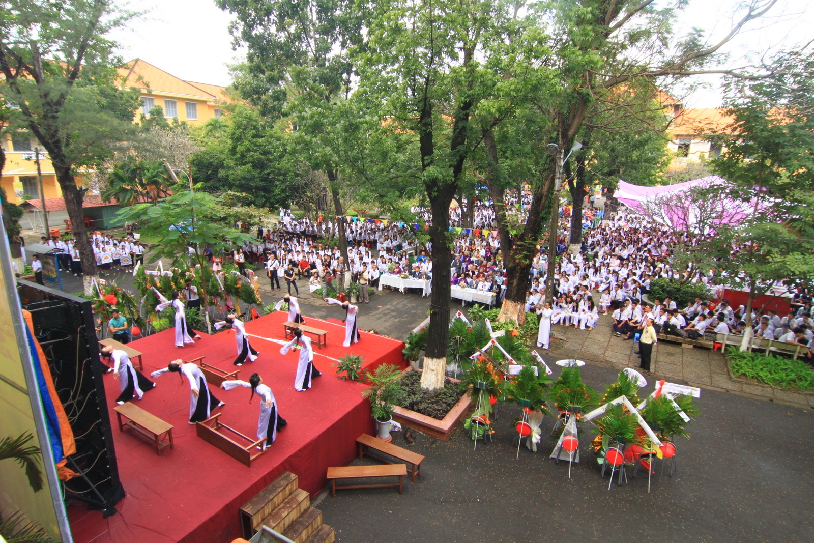 | Điểm nhấn của ngày hội là các tiết mục văn nghệ hoạt cảnh. Từ sáng sớm, nhiều khách mời, cựu học sinh và học sinh đã tề tựu đông đủ dưới sân trường. |