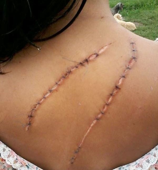 | Một trong những bức ảnh gia đình nữ sinh 15 tuổi chia sẻ trên Facebook. Theo đó, không chỉ khuôn mặt mà trên lưng cô gái cũng bị rạch hai vết rất lớn. |