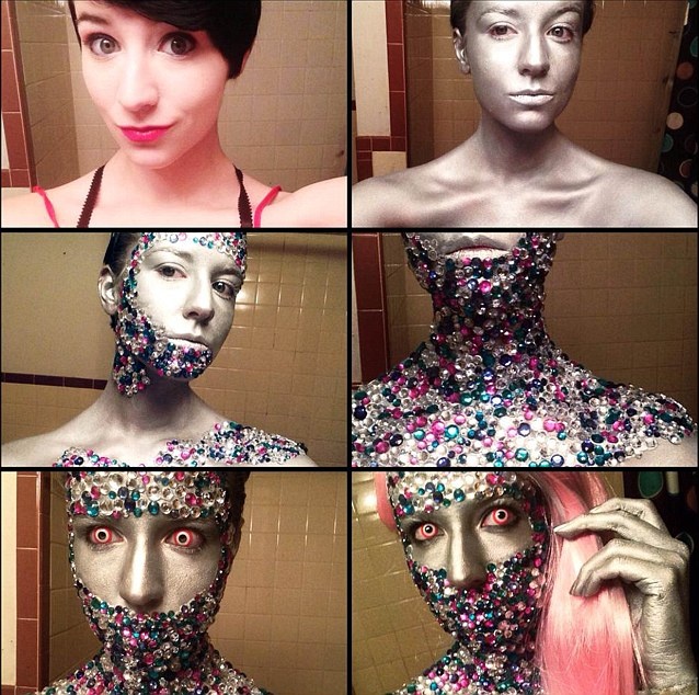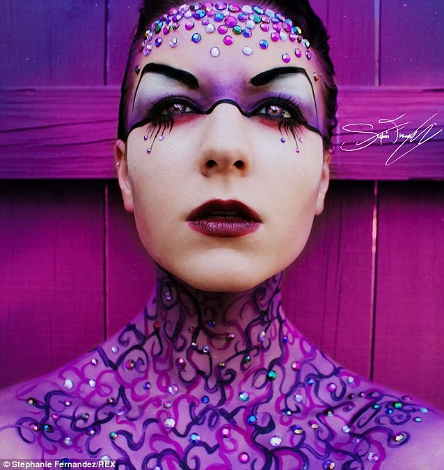 | Cô gái tuổi teen này thích hóa trang thành những nhân vật đặc biết. Đây là chân dung của cô trong chủ đề "Fame" mô tả Lady Gaga với khuôn mặt đính đầy những hạt đá lấp lánh. Với phong cách trang điểm độc đáo và mới lạ, Stephanie mang đến cho người xem cảm giác rùng rợn nhưng đầy ấn tượng. |