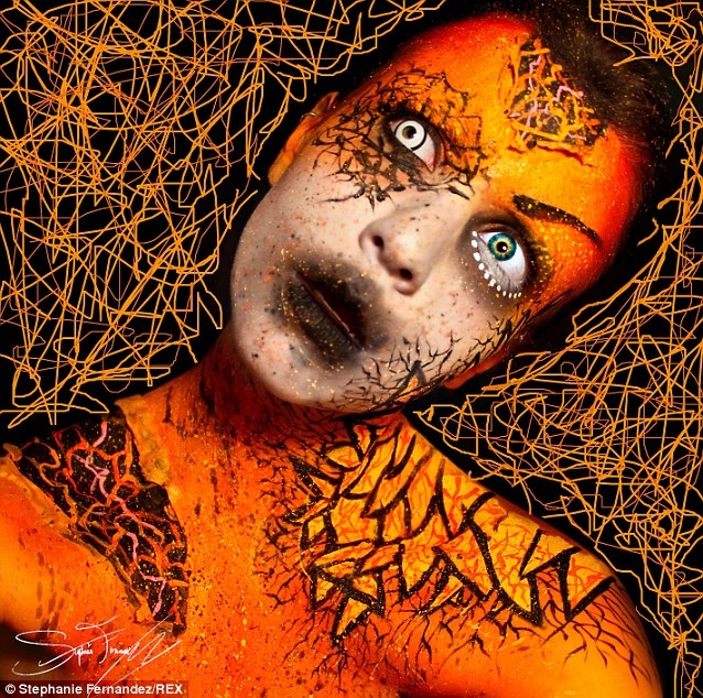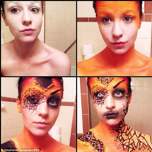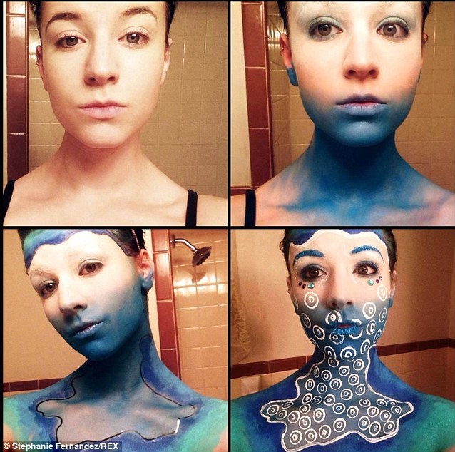 | Trong quá trình trang điểm, Stephanie chụp lại những bước cơ bản để đăng tải lên cho moi người thấy rõ. Stephanie đã tự học trang điểm từ khi 14 tuổi. Những bức chân dung trên khuôn mặt của cô thể hiện rõ các kỹ thuật chuyên môn với cách tạo hình khác lạ và màu sắc tuyệt đẹp |