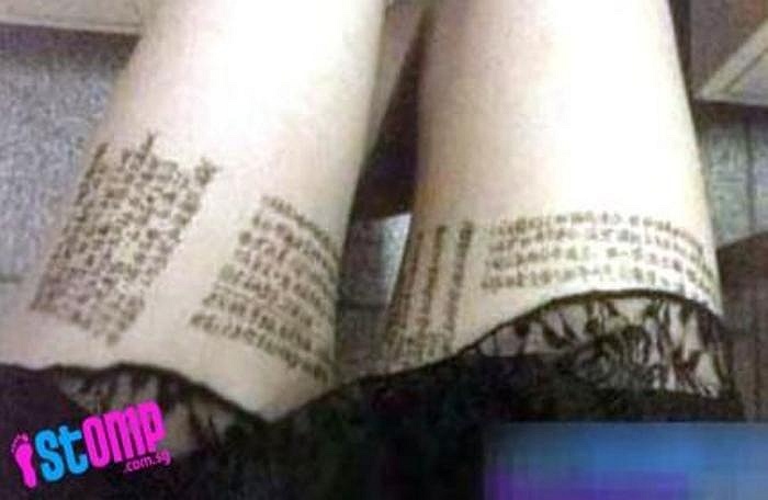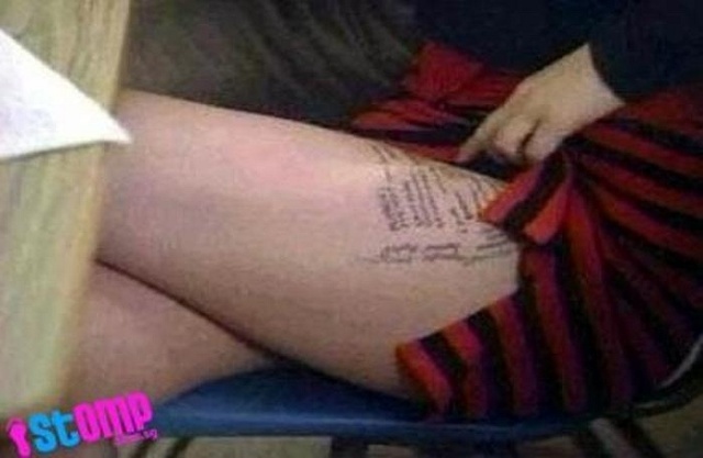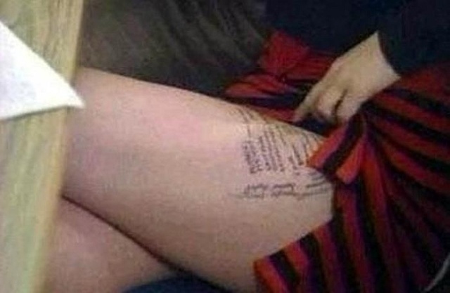| Trong ảnh là một nữ sinh với đôi chân trắng nõn và thon dài bị bắt quả tang viết chi chít chữ trên đùi trong lúc thi tại trường. |