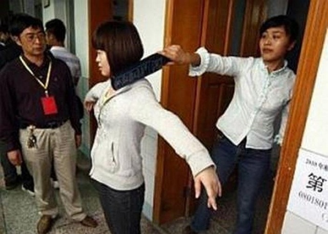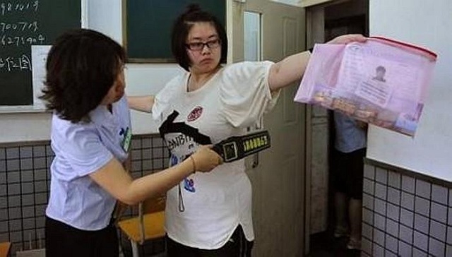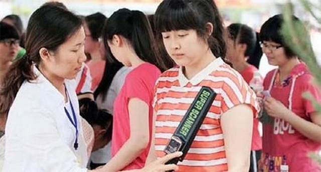 Tại một số trường học ở Trung Quốc, các sinh viên bị cấm mặc những bộ quần áo có đính kim loại trước khi bước vào phòng thi. |