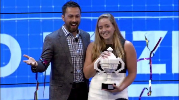 | Olivia Hallisey nhận cúp cùng giải thưởng 50.000 USD từ nhà tổ chức. |