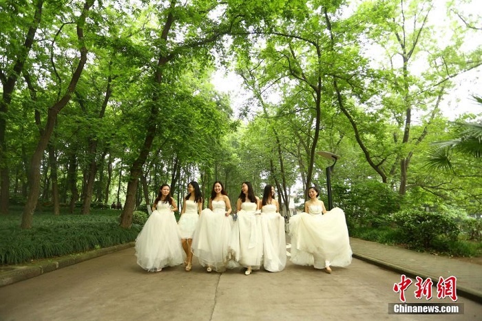 | Hình ảnh 6 nữ sinh diện váy cưới màu trắng tạo nên nét khác lạ trong ảnh kỷ yếu. |