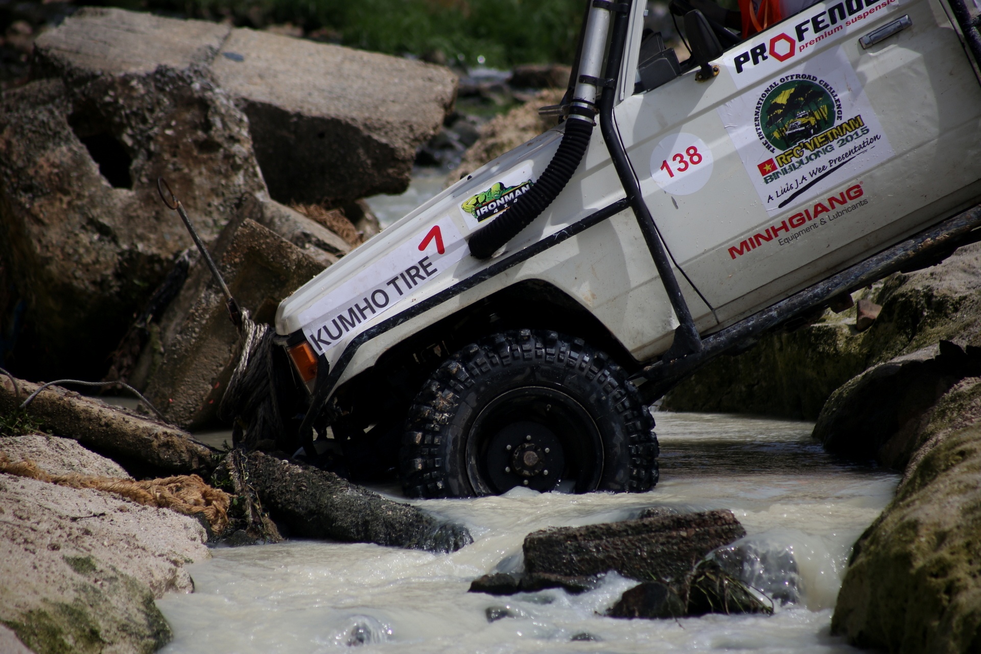 Dù gầm khá cao nhưng đất ven bờ suối khá mềm nên xe không thể bám đường.