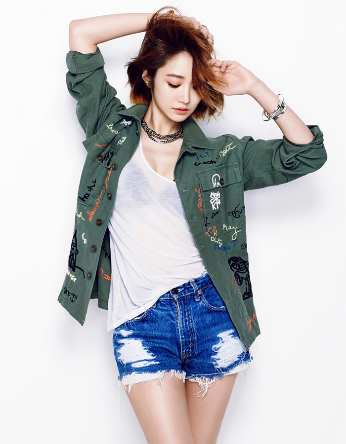 | Go Joon-hee trông thật trẻ trung khi kết hợp quần shorts denim cùng jacket quân đội. |