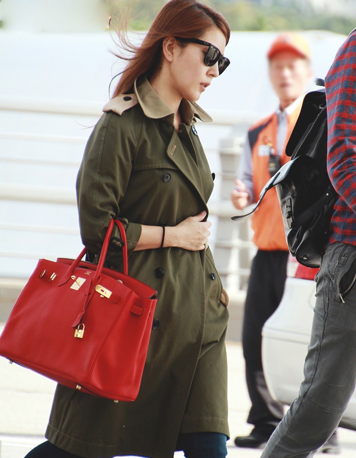| BoA khéo léo khoác jacket quân đội dáng dài, chọn túi xách màu đỏ làm nền nổi bật. |
