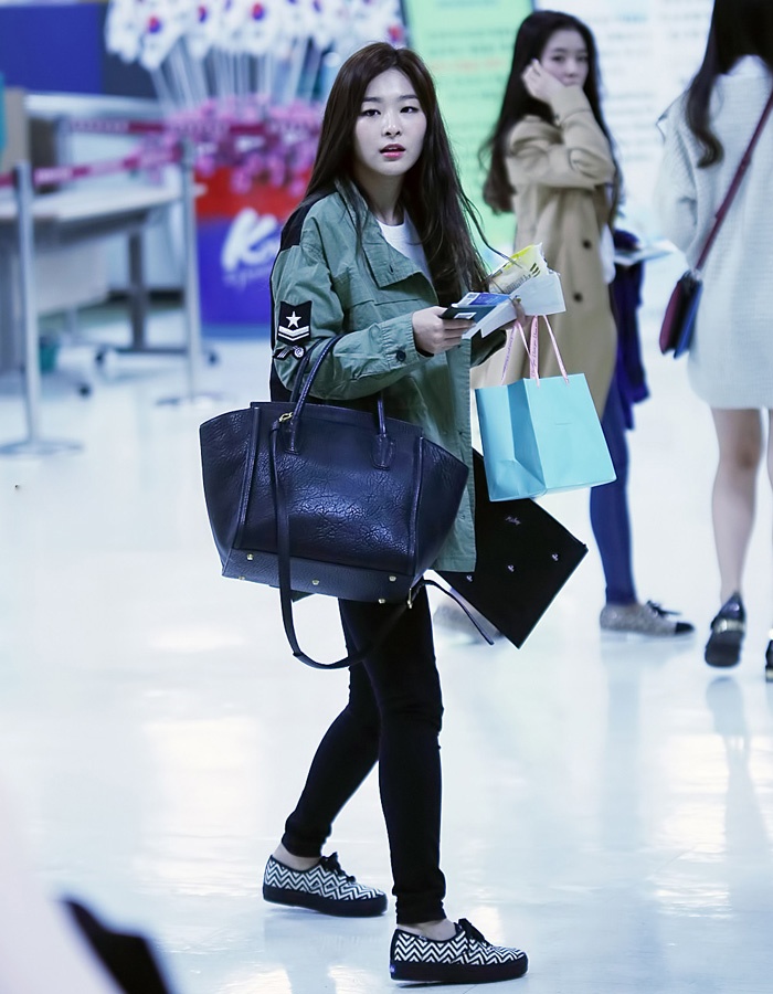 | Seulgi (Red Velvet) khoe chiếc áo khoác nhấn nhá màu đen. |