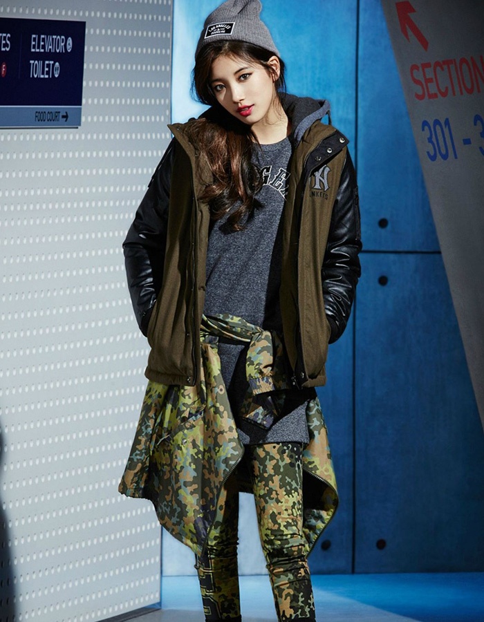 | Trong bức ảnh khác, Suzy mới lạ trong gam màu đối lập nổi bật giữa váy hoa nữ tính và áo khoác. |