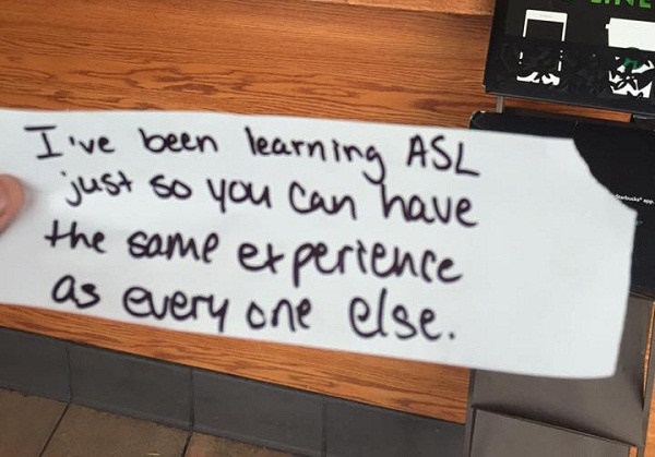 Theo Fox News, Ibby Piracha (23 tuổi, sống tại Leesburg, Virginia) là khách hàng quen thuộc của cửa hàng Starbucks tại địa phương. Mới đây, anh nhận được một mảnh giấy từ người thu ngân có thông điệp: "Tôi đã học ngôn ngữ ký hiệu để bạn có thể có những trải nghiệm giống như bất cứ người nào khác khi đến với cửa hàng".