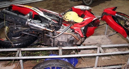 | Chiếc xe máy của nữ chiến sỹ công an bị gãy đôi sau khi đâm vào thành đường. |