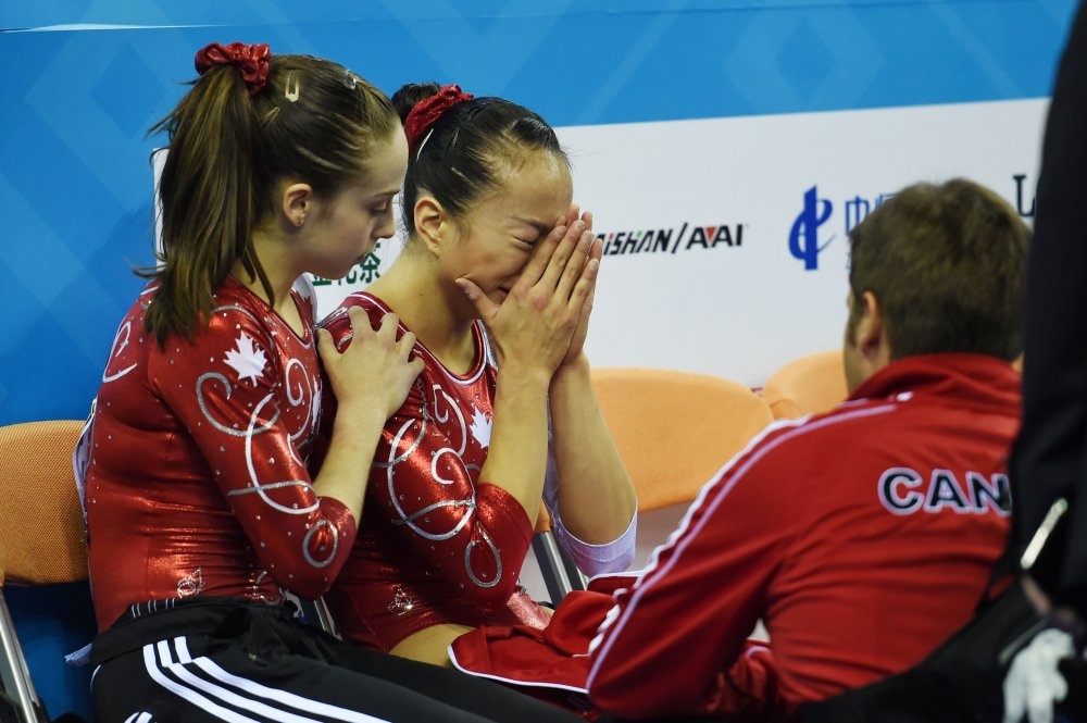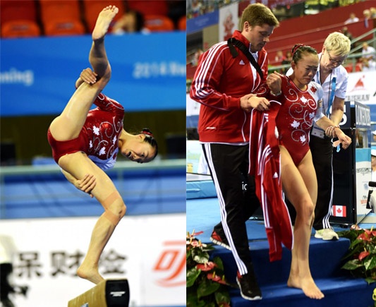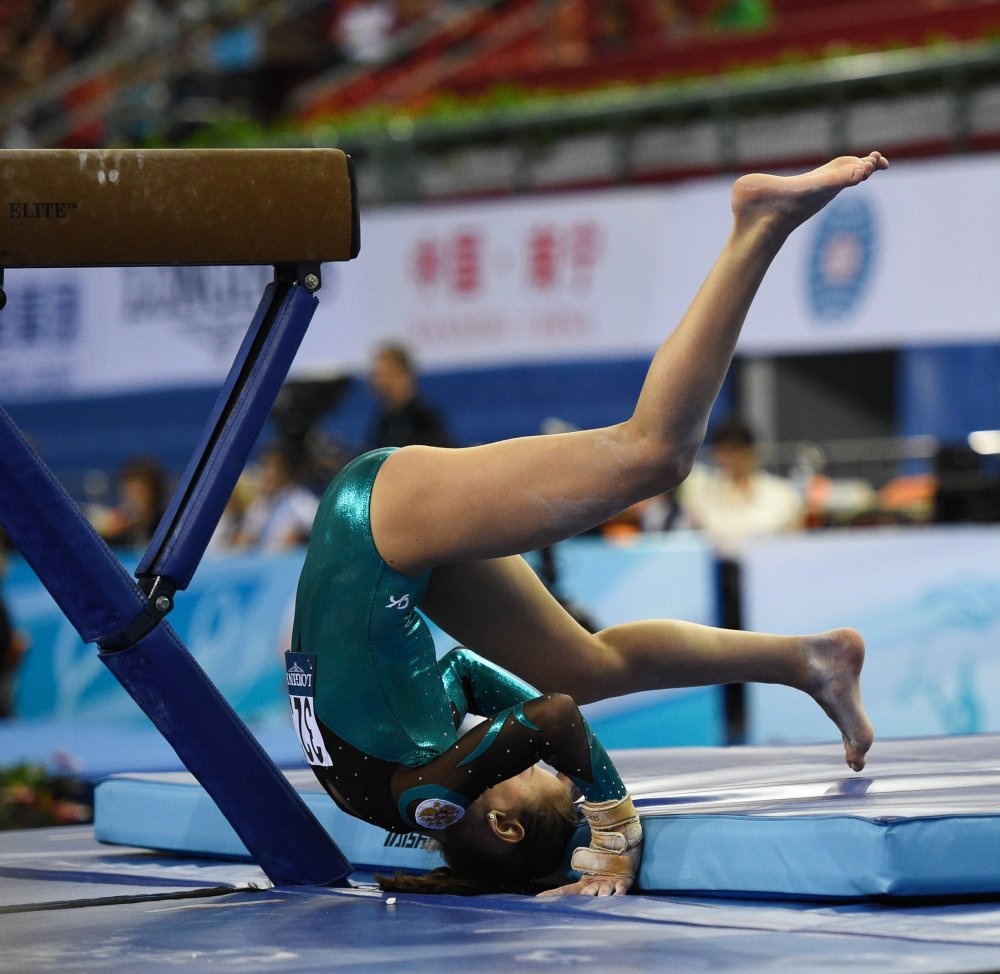 | Trong bài biểu diễn tại vòng loại cầu thăng bằng nữ, VĐV Aleeza Yu của Canada trượt chân và ngã khá mạnh xuống sàn đấu. |
