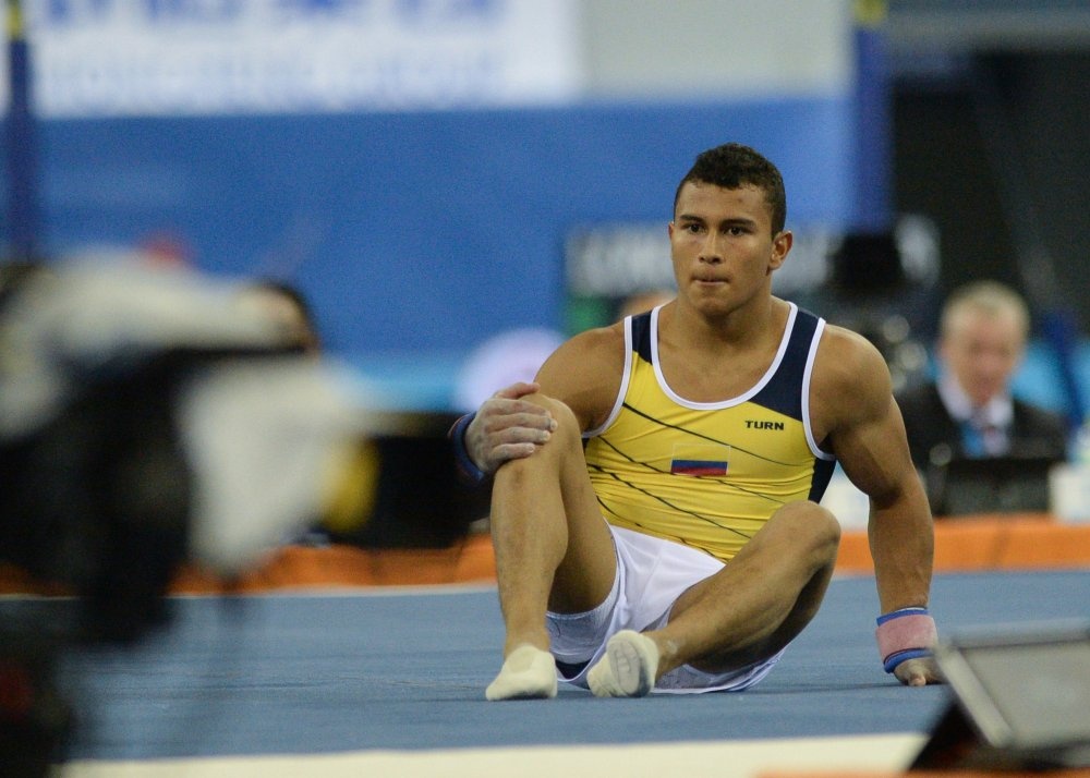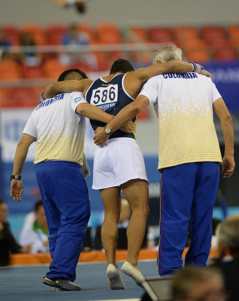 | Javier Sandoval Afanador cũng gặp vấn đề với cái đầu gối phải sau bài thi nhảy chống. |
