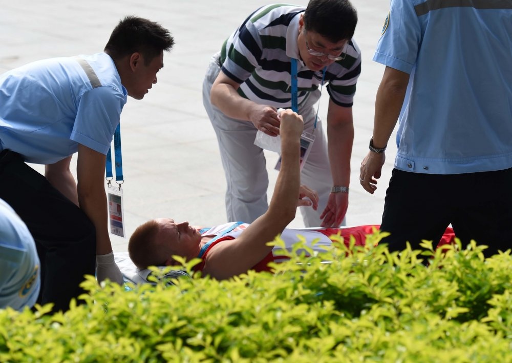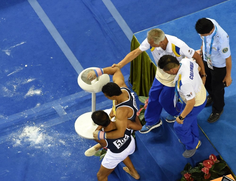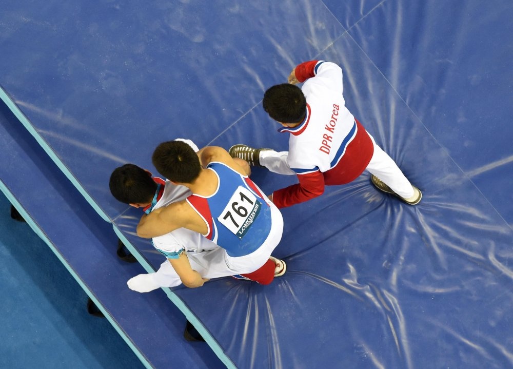 | Ban huấn luyện của đội tuyển thể dục dụng cụ CHDCND Triều Tiên phải cõng Kwang Chun rời khu vực thi đấu. |