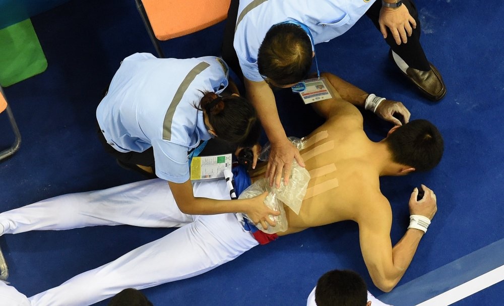 | Các nhân viên y tế phải chăm sóc cho Kim Kwang Chun (CHDCND Triều Tiên) sau khi anh phải bỏ dở bài thi xà đơn vì chấn thương lưng. |