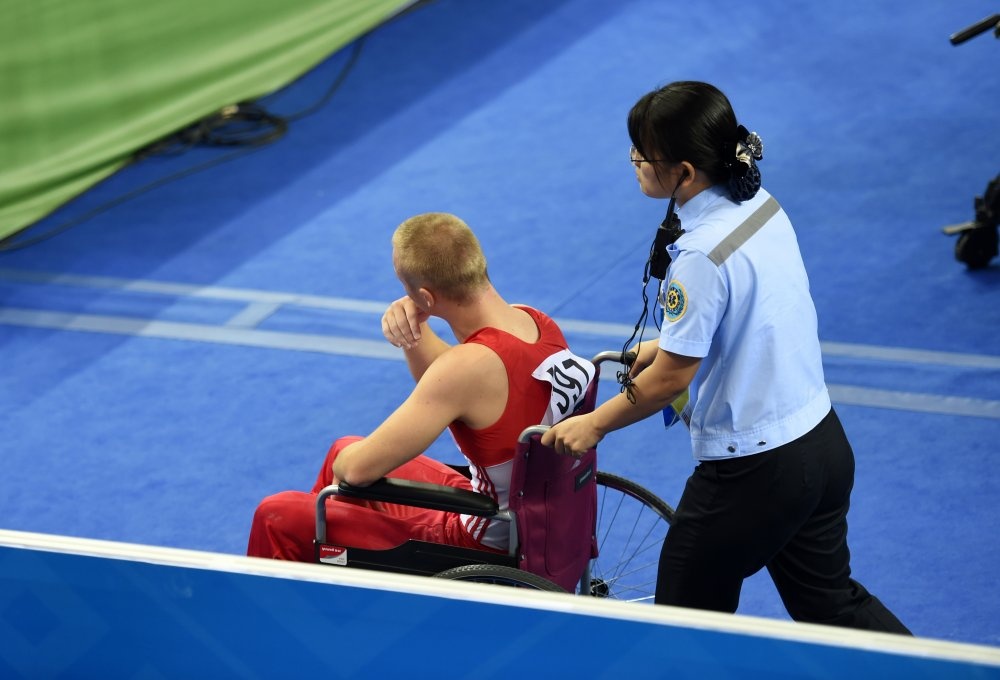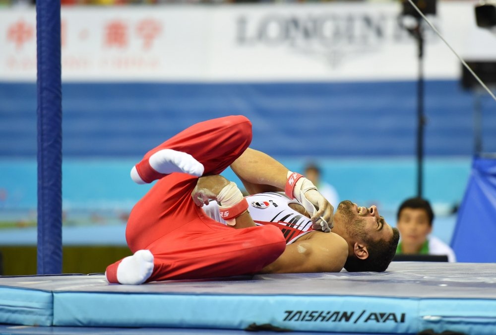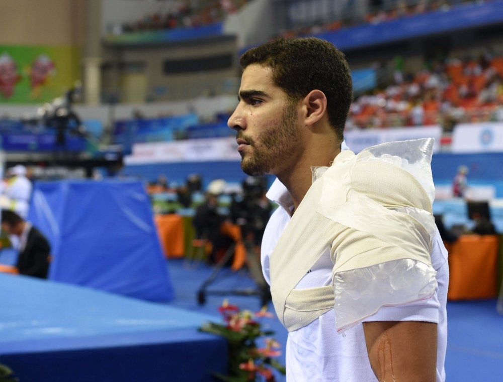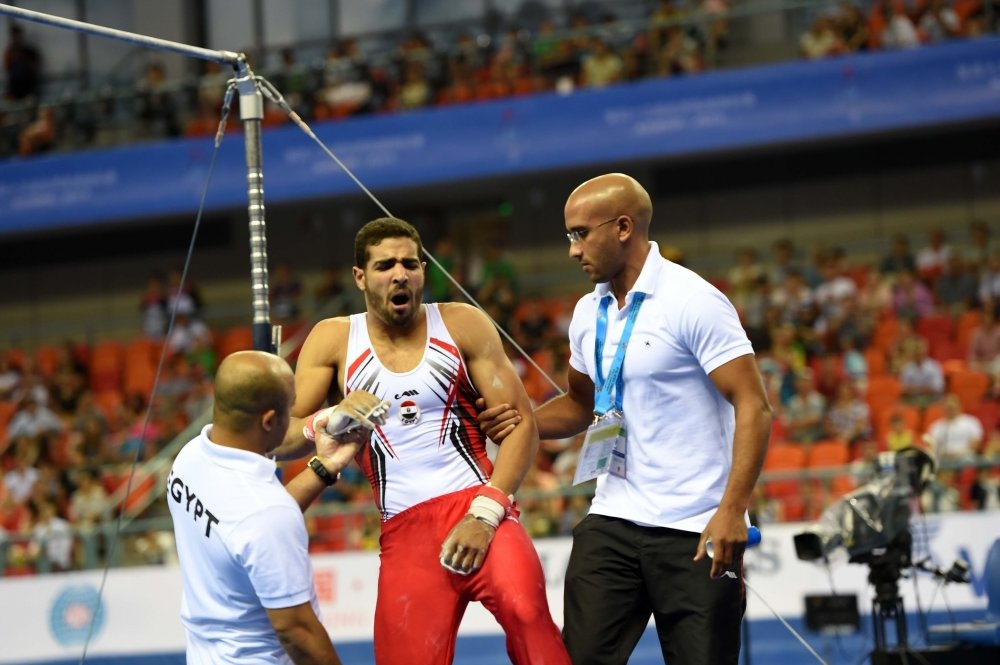 | VĐV người Ai Cập, Islam Hatem Abou Hamda chấn thương khá nặng ở vùng vai trái trong lúc khởi động trước khi bước vào bài thi xà lệch. |