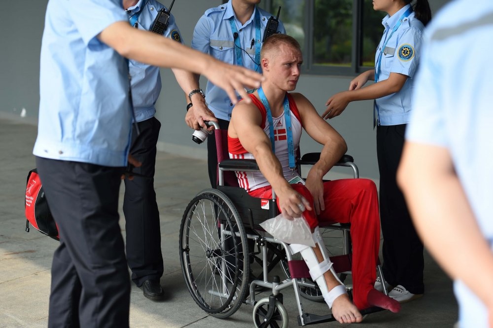 | VĐV người Đan Mạch, Kasper Rydberg dính chấn thương khá nặng ở đầu gối phải. Anh thậm chí phải di chuyển bằng xe lăn để cố định vết thương. |