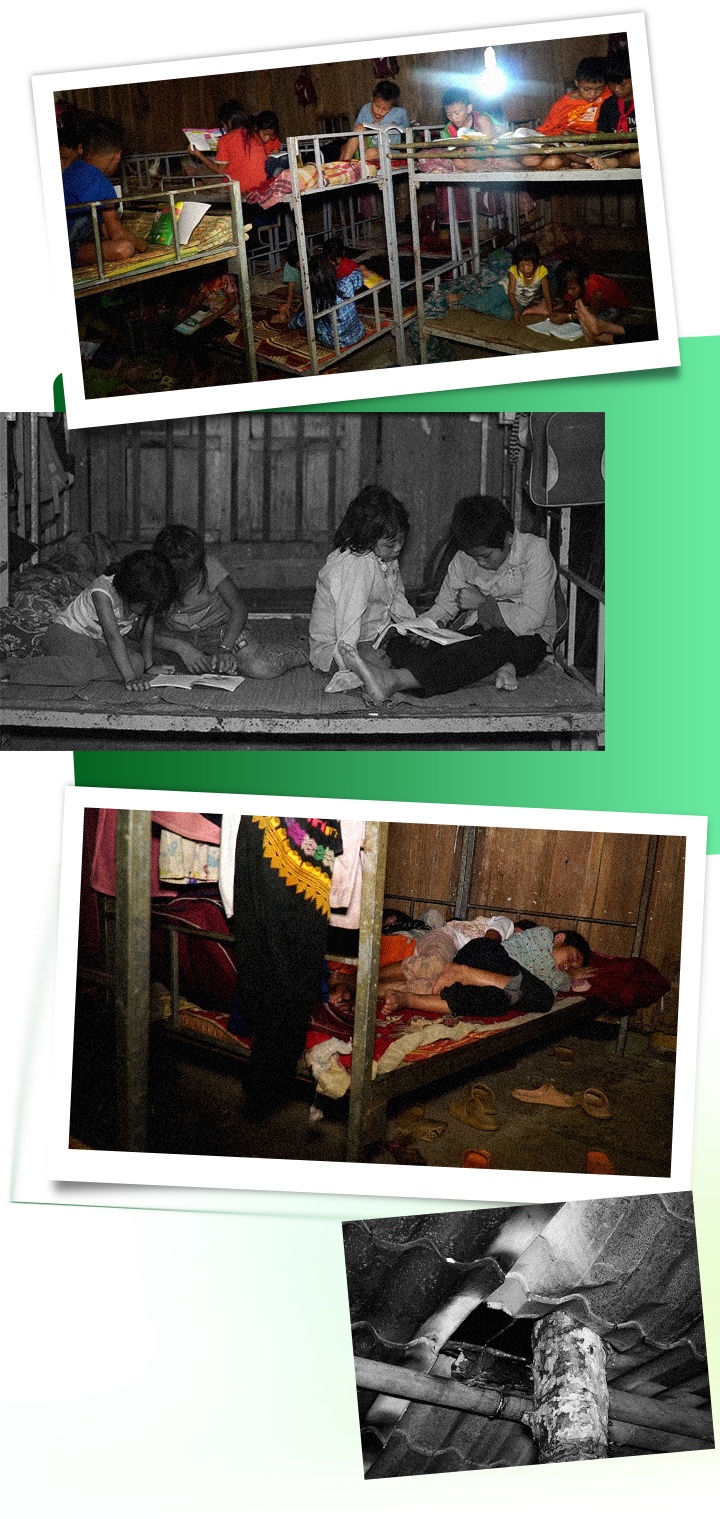Vốn không phải một điểm trường nội trú, nhưng lâu nay vì thương các em học sinh dân tộc Khơ Mú phải đi học xa nhà đến 19-20 km, các thầy ở Bắc Lý 2 vẫn cố gắng dựng một khu nhà tạm để các em ở lại. Khu “ký túc xá” được tạo nên đơn sơ từ tre nứa và gỗ ghép, bên trong là dãy giường tầng cũ nát, hoen gỉ, nhiều chỗ phải vá víu bằng những thanh tre.