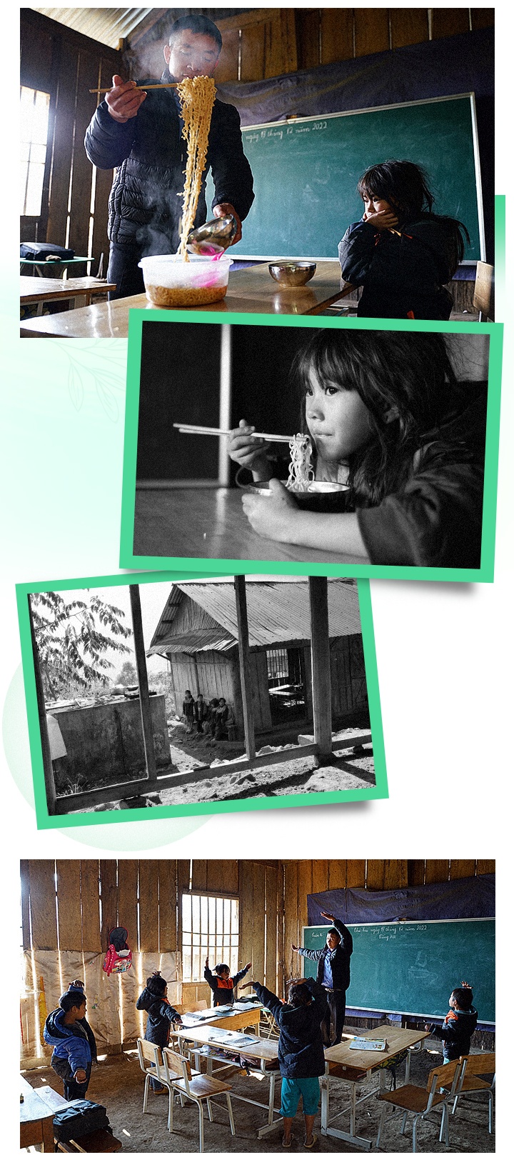 Không có bếp, thầy Thi gom một đám củi ngay dưới mái hiên để tránh mưa, đun một nồi canh to với các loại rau học sinh mang đến. Đến giờ cơm, thầy thả thêm mì gói vào canh rồi mang cả nồi và một cái chậu đựng mèn mén ra cho các em ăn.