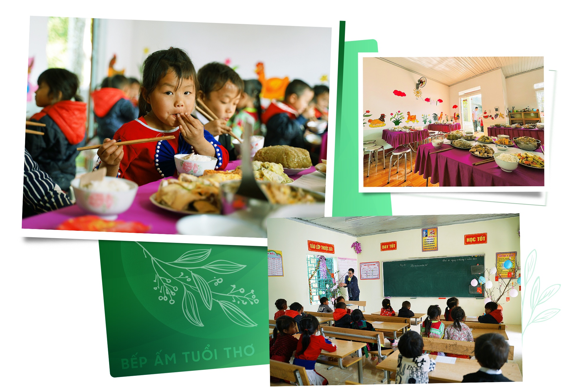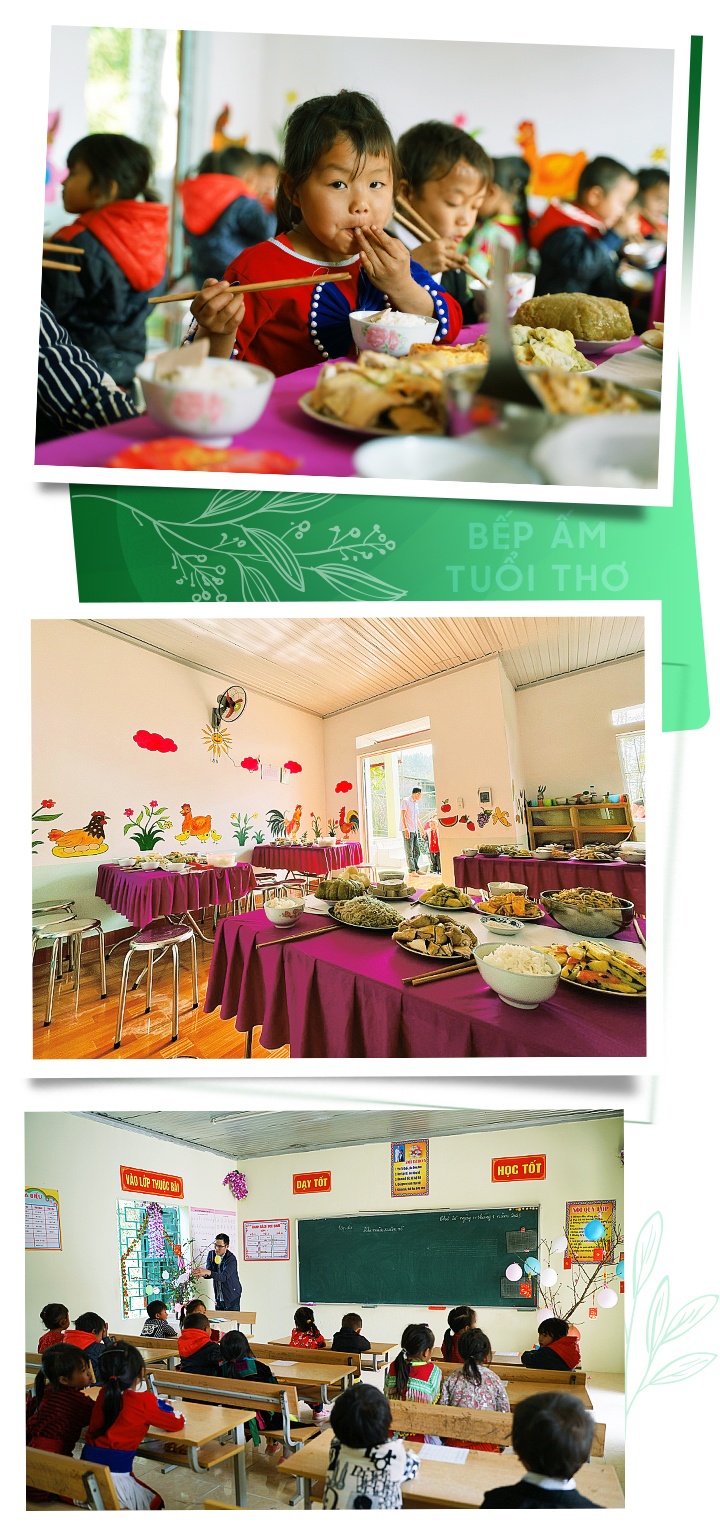 Đặc biệt hơn cả là “Bếp ấm tuổi thơ” do VPBank hỗ trợ 200 triệu đồng để xây dựng. Đây là nhà ăn rộng rãi với đầy đủ dụng cụ nấu nướng, bàn ghế ngồi ăn, nơi đem đến cho các em học sinh ở đây những bữa ăn đa dạng, đầy đặn, đủ dưỡng chất. “Bữa trưa không bát đũa với mỳ tôm trộn mèn mén trước đây chỉ còn trong ký ức, giấc mơ của những em học sinh và của chính tôi đã thành hiện thực rồi”, thầy Thi nghẹn ngào nói.