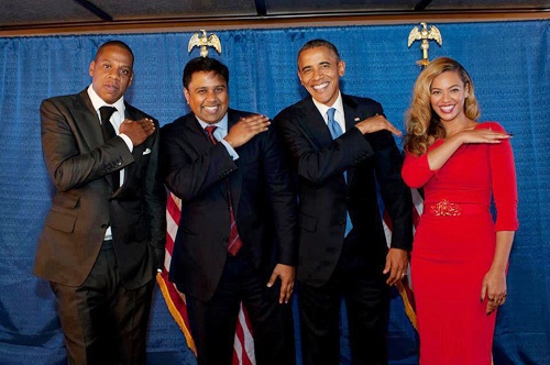 | Tổng thống Barack Obama thực hiện động tác "phủi bụi" kinh điển cùng vợ chồng Jay-Z và Beyoncé. Ảnh: Straight from the A |