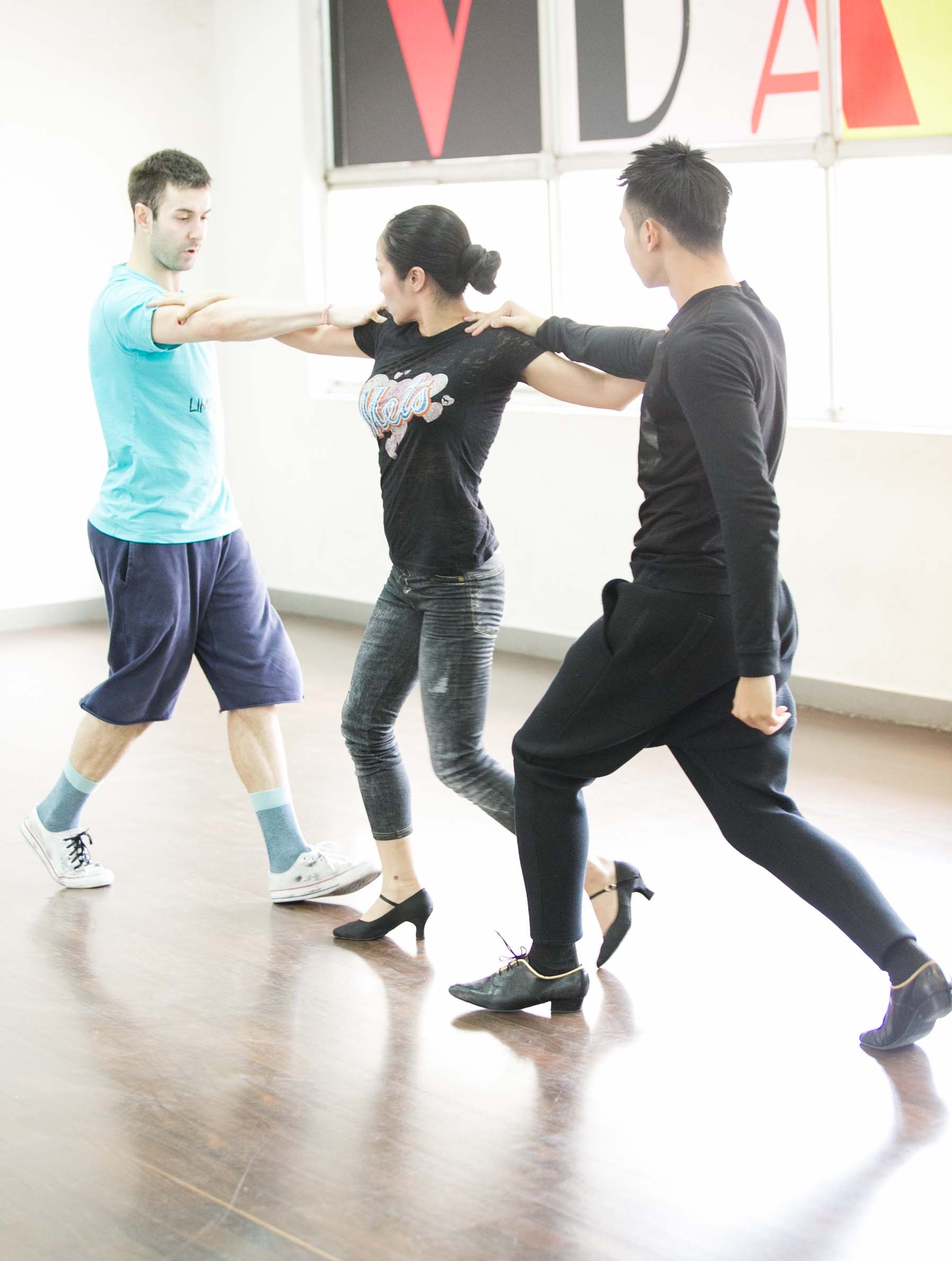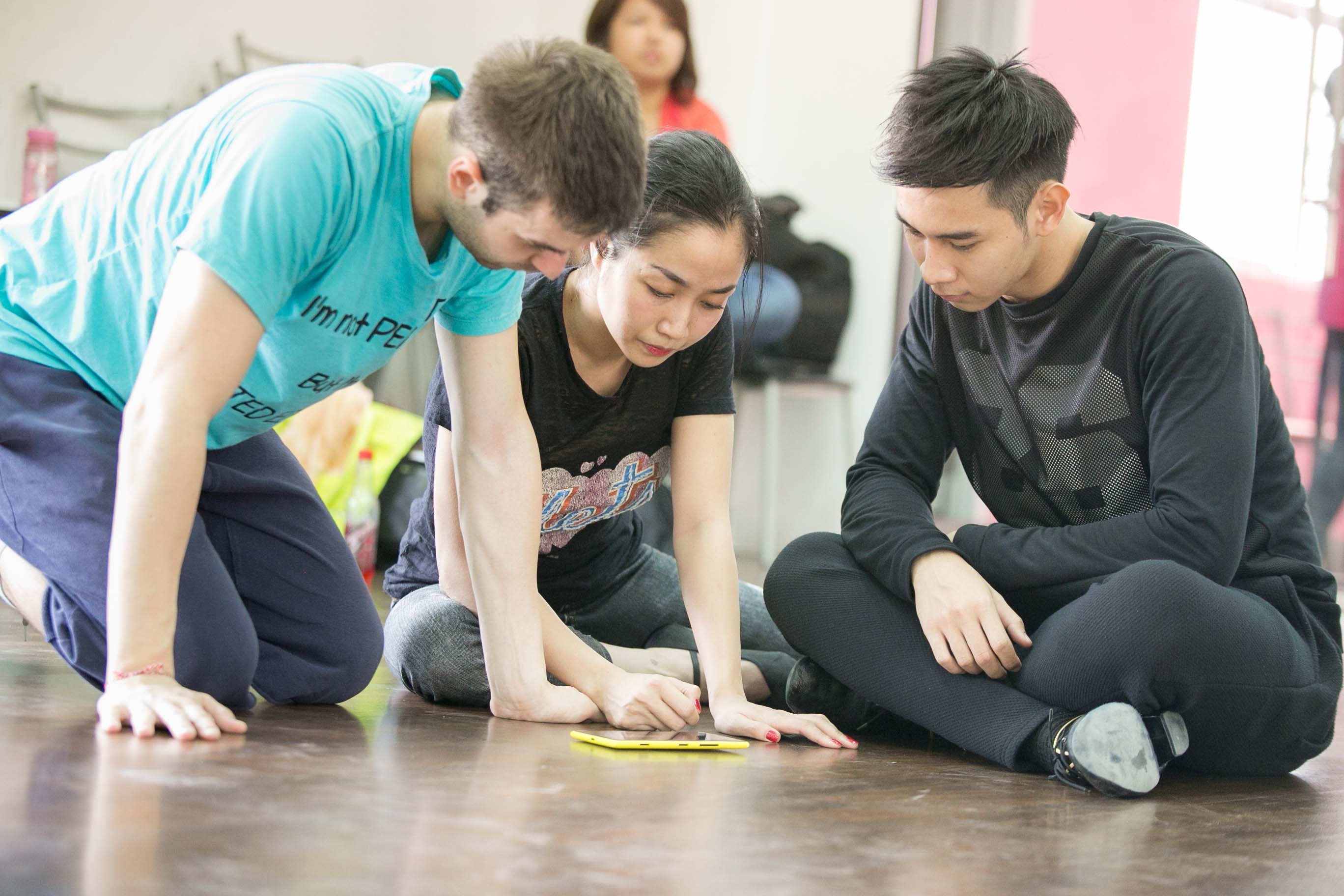 | Ốc Thanh Vân và hai bạn nhảy tranh thủ xem lại bài tập để tránh sai lầm khi đứng trên sân khấu. |