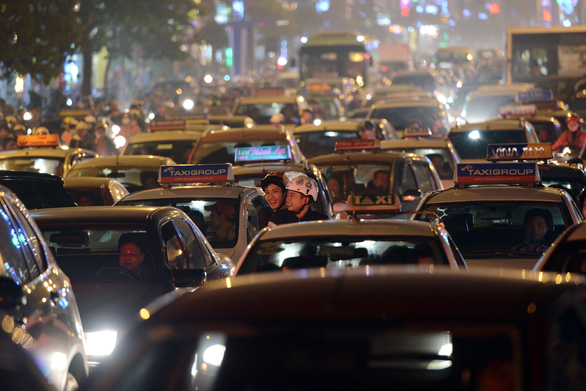| Tại Hà Nội: Nhiều tuyến đường lâm vào cảnh ùn tắc giao thông ngay từ chiều tối. Ảnh chụp tại phố Xã Đàn (quận Đống Đa). Taxi hoạt động nhiều hơn bình thường do lượng người đổ ra đường đón Giáng sinh đông. |