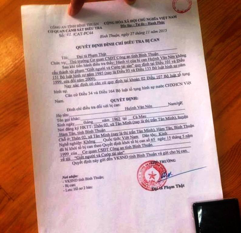 Sáng 28/11, tại trụ sở UBND thị trấn Tân Minh, huyện Hàm Tân (Bình Thuận), lãnh đạo cơ quan CSĐT, VKSND và Tòa án tỉnh Bình Thuận đã gặp ông Huỳnh Văn Nén (53 tuổi, quê Cà Mau, trú tại thôn 2, Tân Minh, Hàm Tân, Bình Thuận) - người bị án tù chung thân trong vụ giết bà Lê Thị Bông để công bố quyết định đình chỉ điều tra bị can.