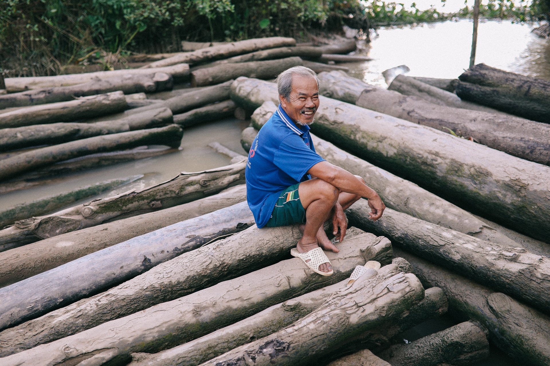 Mỗi người một việc bắt tay vào đốn gỗ. Người cưa, người xẻ. Chặt hạ xong, ông thuê xe mang về nhà. Những thân gỗ to tròn ngâm dưới dòng sông Hậu từ năm nay qua năm khác. Ông bảo đó là cả gia tài của mình, cả trăm ngôi nhà đang đợi để được cất lên. Mỗi lần có nhà cần dựng, ông kéo lên phơi nắng lột vỏ.