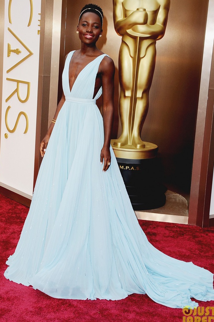 | Nữ diễn viên phụ xuất sắc Lupita Nyongo trong chiếc đầm bạc hà như nuốt chửng vòng 1. |