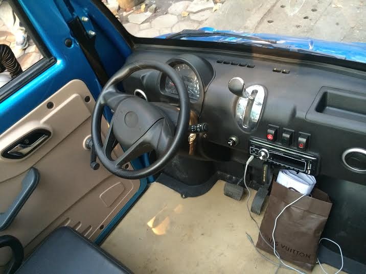 Nội thất xe bao gồm ghế ngồi được bọc da, tap-lô ốp nhựa. Hộp số với số tiến, lùi và số "mo", điều hòa hai chiều. Cửa kính quay tay. Xe khởi động bằng chìa khóa cơ. Hệ thống giải trí với một đầu đĩa hỗ trợ cổng USB và giắc cắm 3.5 mm phát nhạc. Sau ghế lái là hai loa trầm.