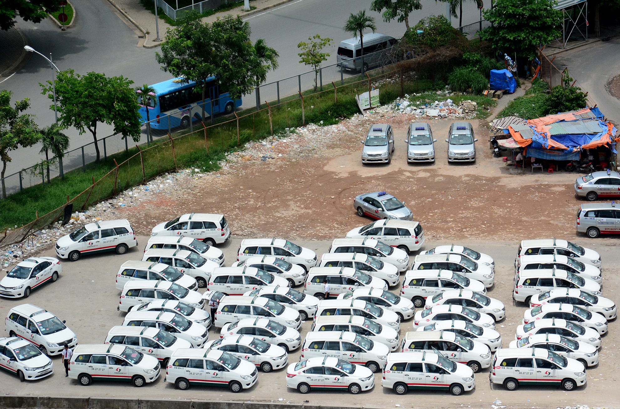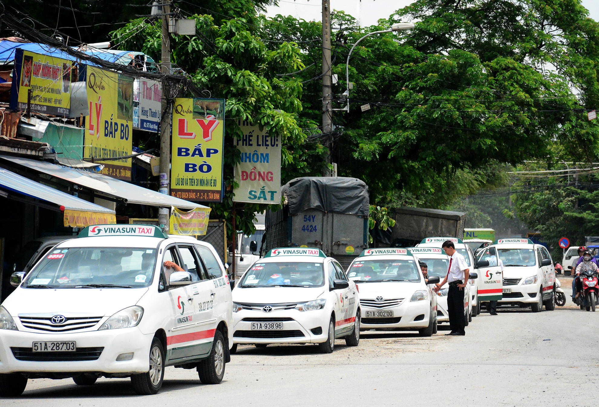 | Hàng chục taxi chờ lên tài tại một bãi đỗ bên ngoài sân bay. |