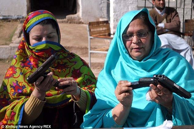 | Cảnh sát Pakistan hướng dẫn những nữ sinh ở thành phố Karachi cách sử dụng súng. Tháng 12 năm ngoái, tổ chức khủng bố Taliban tấn công vào một trường học ở thành phố Peshawar khiến 145 người thiệt mạng. Phần lớn trong số đó là những em học sinh. Ảnh: Dawn.com