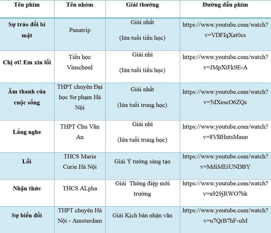 Giải nhất lứa tuổi trung học đã được trao cho đội KWN trường THPT chuyên Đại học Sư Phạm Hà Nội với bộ phim Symphony of Life (Âm thanh của cuộc sống). Bộ phim The exchange of secret (Sự tráo đổi bí mật) của đội Panatrip gồm 6 bạn học sinh lớp 5 đến từ 6 trường tiểu học đã giành giải nhất lứa tuổi tiểu học.
