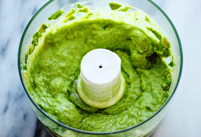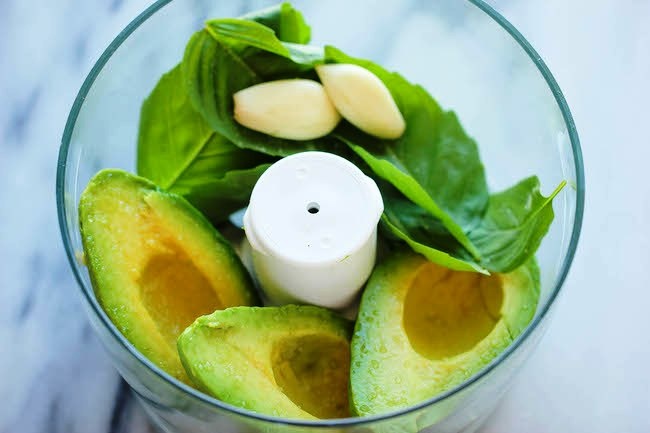 Cho bơ, húng quế, tỏi và nước cốt chanh, muối, tiêu vào máy xay nhuyễn. Trong lúc xay, thêm dầu ô-liu vào từ từ, trộn thêm 30 giây nữa rồi tắt máy. |