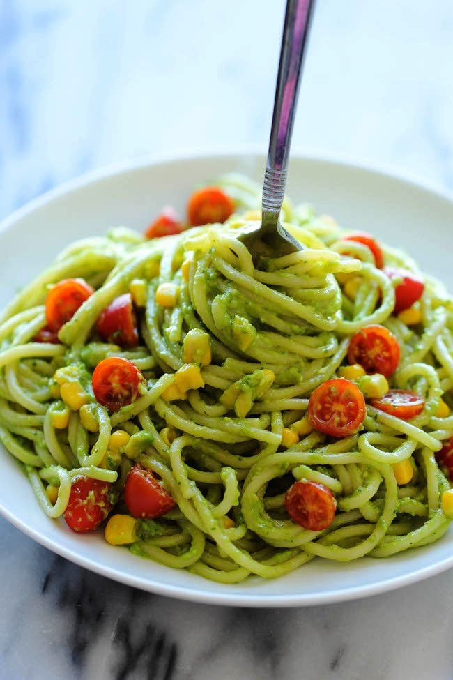 Nguyên liệu sau: 450 gram mì Ý, 2 quả bơ, vài lá húng quế tươi, 2 tép tỏi, 2 muỗng canh nước cốt chanh; muối, hạt tiêu, 1/3 chén dầu ô-liu, 1 chén cà chua bi, 1/2 chén bắp hạ. |