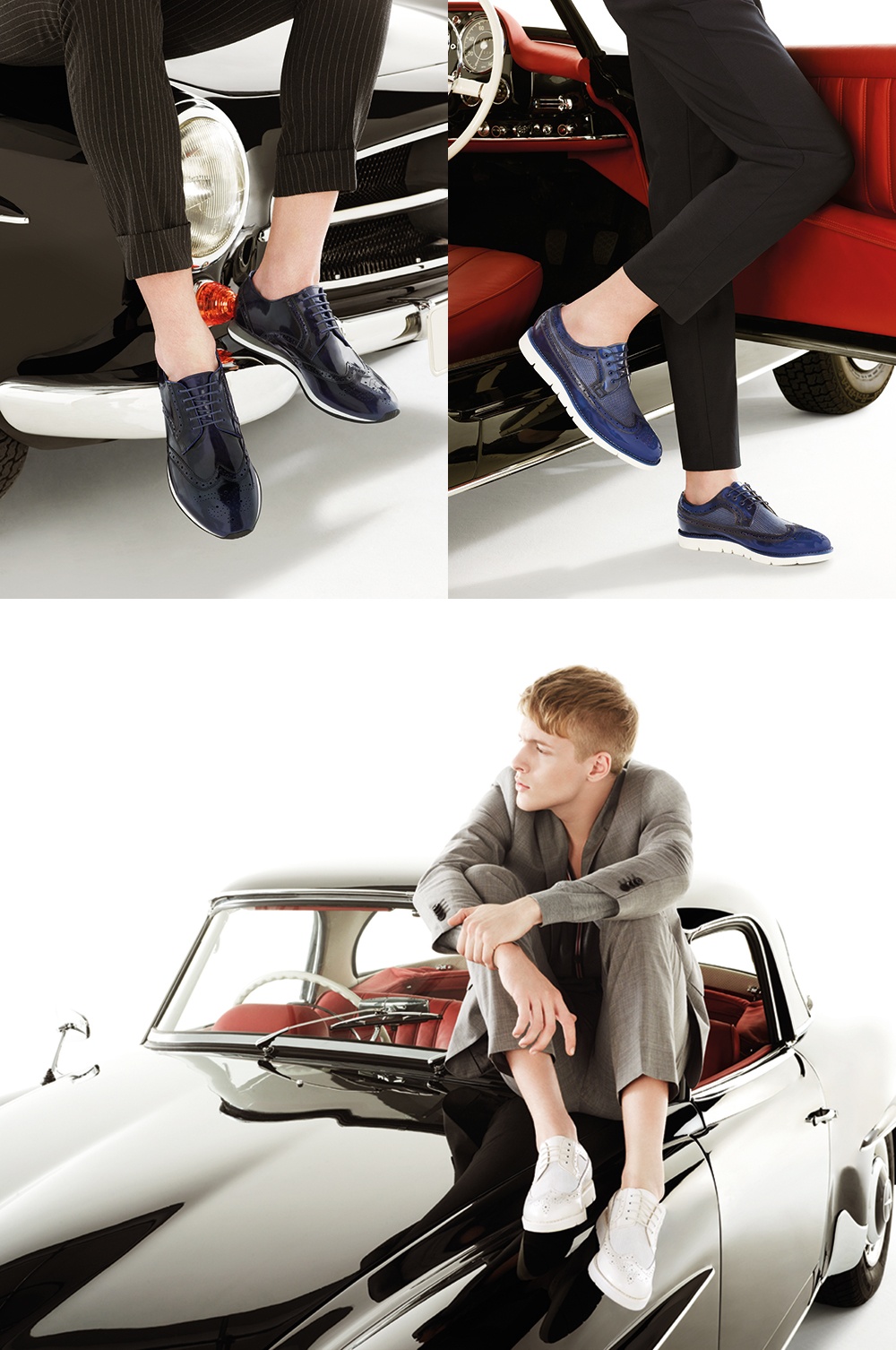 Trong BST dành cho nam, các mẫu giày dạ tiệc lên ngôi với phần đế màu trắng, tương phản trên gam nền xanh và đen. Kiểu giày wingtip đạt được sự phóng khoáng nhờ những họa tiết trang trí brogue phối hợp cùng đường cắt may tỉ mỉ.