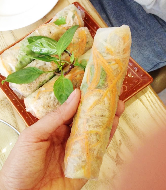 | Bì cuốn có nem chạo, cà rốt, rau sống ăn rất mát mà không ngấy. |
