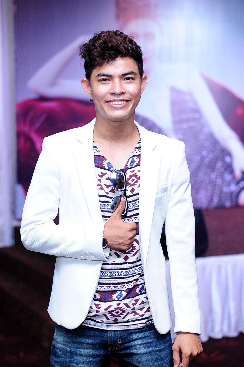 | Nam ca sĩ Bùi Caroon mặc bảnh bao đến chúc mừng đàn chị. Anh và Pha Lê quen thân khi tham gia X Factor. |