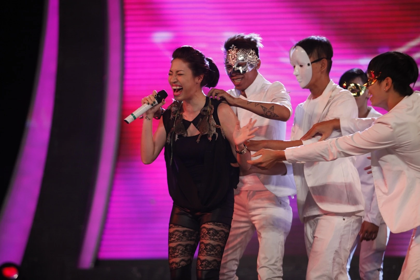 | Tuy vô cùng hoảng sợ, nhưng sự dũng cảm và kiên cường của Pha Lê đã giúp cô hoàn thành xuất sắc thử thách. Đến giám khảo Thu Minh cũng phải đứng dậy để dành cho cô những lời khen: “Nếu là chị đang hát mà có người đặt lên người cóc nhái hay rắn thì chị xỉu luôn chứ không thể hát được". |