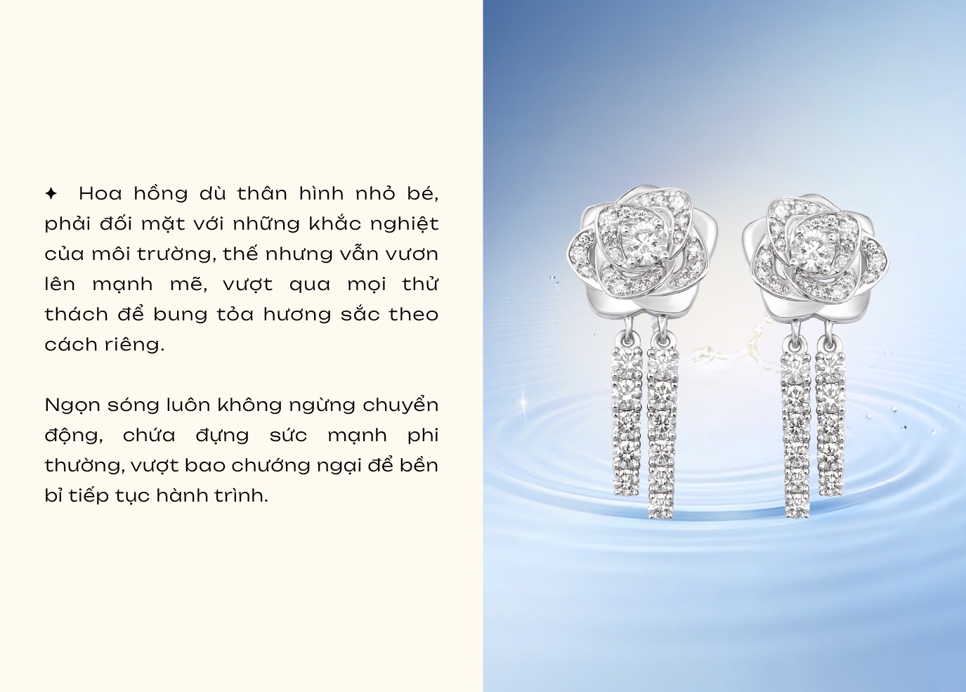 Lấy cảm hứng từ hình tượng hoa hồng và những làn sóng, bộ trang sức kim cương Audax Rosa hội tụ vẻ đẹp từ ánh sắc của những viên kim cương tinh tuyển, hòa cùng sự mềm mại, uyển chuyển trong từng chi tiết thiết kế hiện đại. Dây cổ là điểm nhấn với thiết kế hoa hồng đính kim cương tinh xảo, kết hợp cùng hai dải kim cương phụ được thả rơi nhẹ nhàng, tạo cảm giác mềm mại như những con sóng. Nhẫn và bông tai đồng bộ với họa tiết hoa hồng nổi bật, tôn lên vẻ nữ tính, đầy sang trọng. Bộ trang sức là một lựa chọn tinh tế giúp quý cô tỏa sáng trong những dịp đặc biệt.
