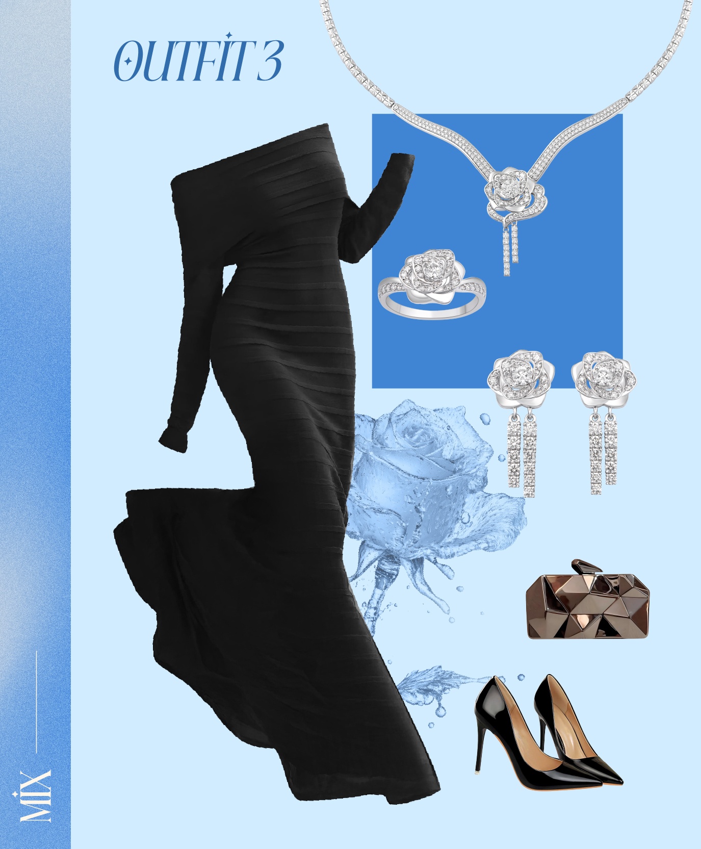 Có những khoảnh khắc, phụ nữ cần một cú chạm biến hóa để bước vào vai nữ hoàng dạ tiệc kiêu sa, cuốn hút mọi ánh nhìn. Chiếc đầm đen dáng dài trễ vai, kết hợp cùng giày cao gót đen bóng và chiếc clutch kim loại nổi bật sẽ mang tới cho quý cô một vẻ đẹp kiêu sa, huyền bí. Để hoàn thiện vẻ ngoài, bộ trang sức kim cương Audax Rosa gồm dây cổ, nhẫn và bông tai sẽ là điểm nhấn sang trọng không thể thiếu giúp các quý cô tỏa sáng.