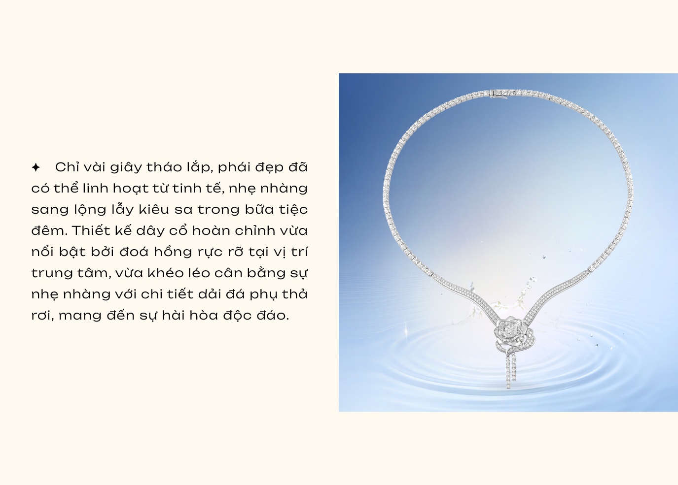 Phong cách đời thường sẽ trở nên “có gu” hơn với điểm nhấn trang sức mà quý cô lựa chọn. Mặt dây mang hình dáng đóa hồng đang nở rộ của dây cổ Audax Rosa khi tháo rời có thể trở thành mặt dây độc lập, mang tới một thiết kế tinh tế và thanh lịch, tôn vinh nét đẹp nữ tính của người phụ nữ.