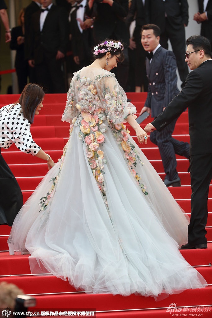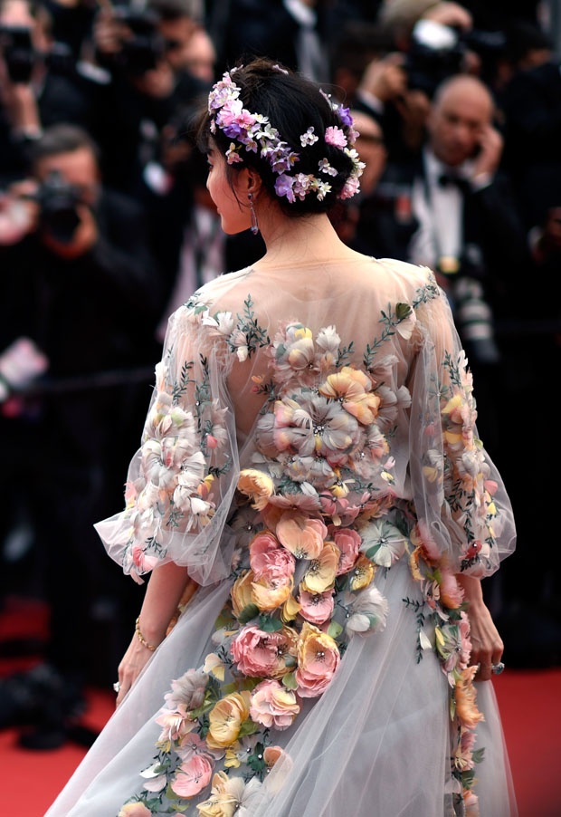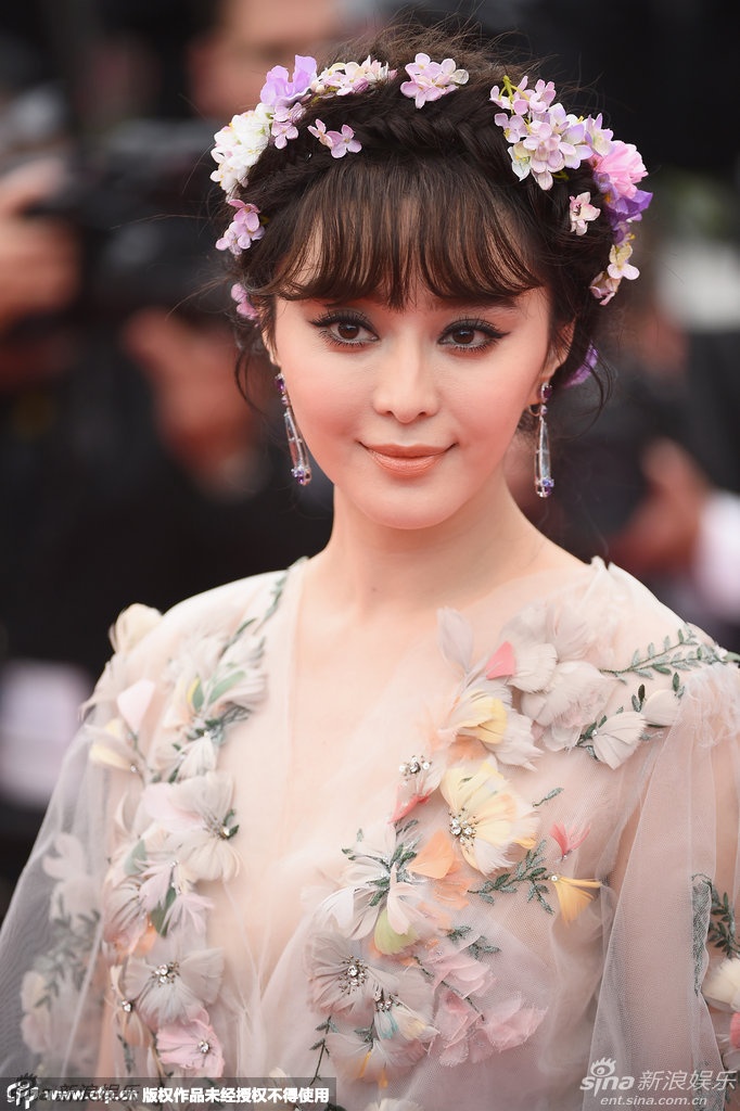 | Dù những cánh hoa cài trên tóc có vẻ làm cho tổng thể bộ trang phục của Phạm Băng Băng giảm đi một chút tinh tế nhưng vẫn đủ để đem đến vẻ ngoài ấn tượng cho mỹ nhân Hoa ngữ. |