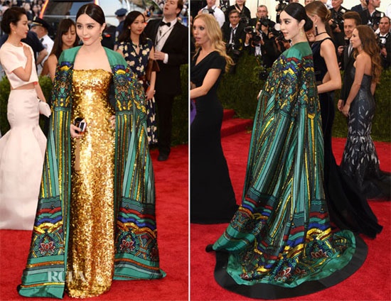 | Mỹ nhân Trung Quốc tại sự kiện Met Gala 2015. Bộ váy dáng cape lấp lánh ánh vàng là của Christopher Bu. |