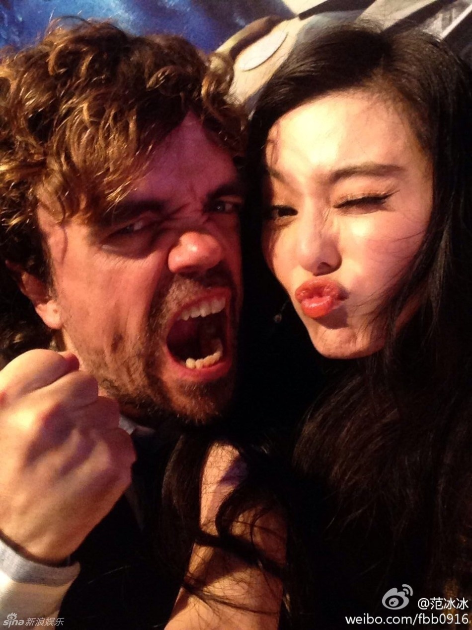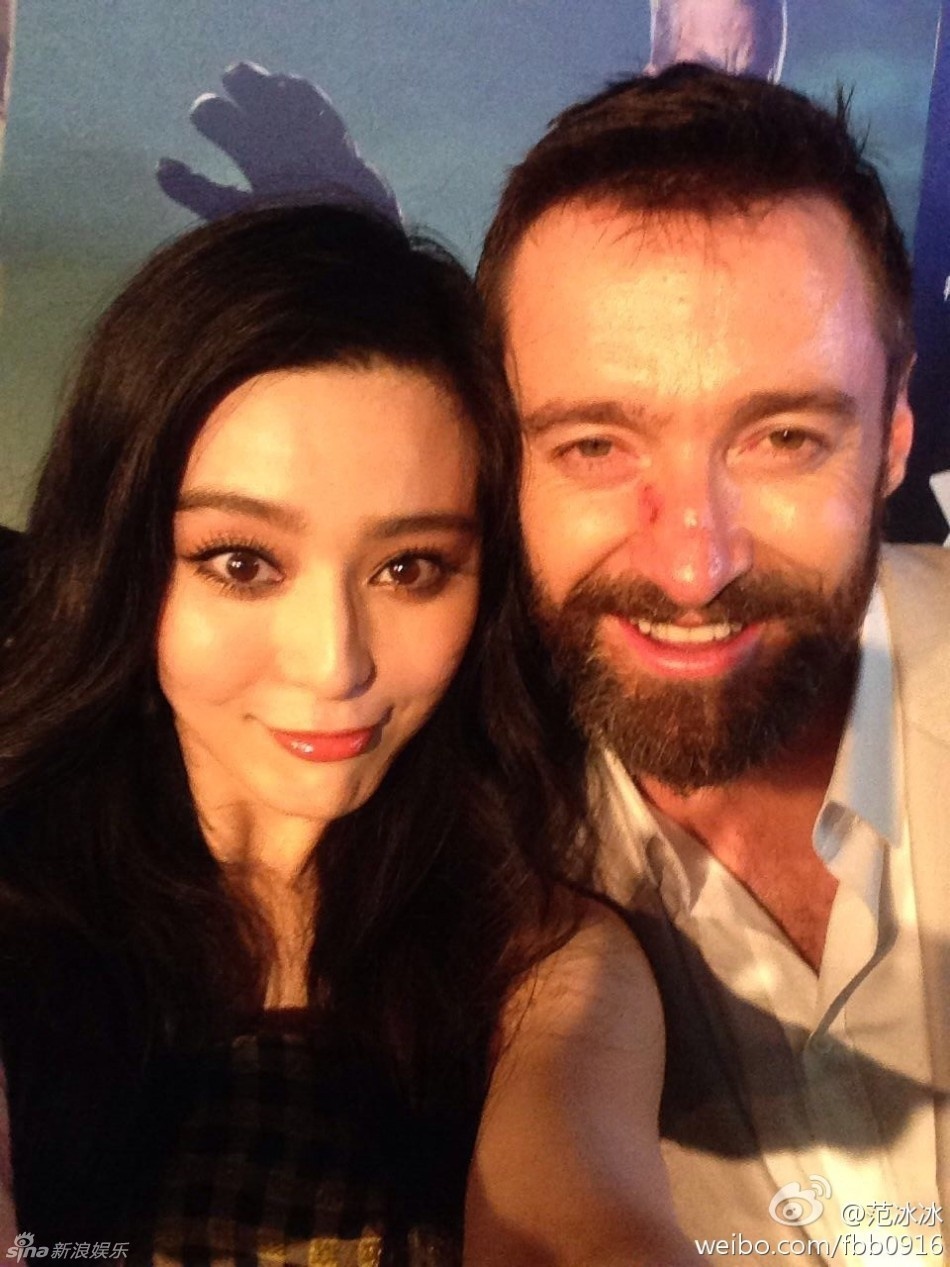 | Phạm Băng Băng nhí nhảnh cùng Người Sói Hugh Jackman phía sau hậu trường. |