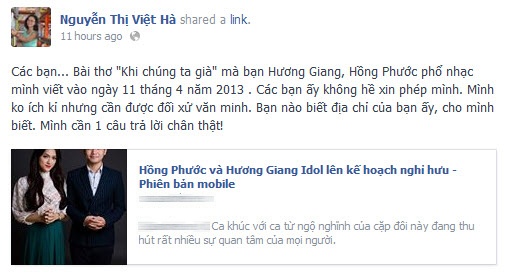 Trên trang cá nhân, nữ tác giả chia sẻ: “Đây là bài thơ của Việt Hà, bạn ca sĩ Hương Giang và bạn Hồng Phước không hề gọi điện xin phép một câu, lén lút phổ nhạc... Mình không tiếc gì nếu các bạn ấy nói với mình một tiếng! Nhưng đây là bài thơ mình tặng một người rất quan trọng của mình! Mình muốn được tôn trọng!”.