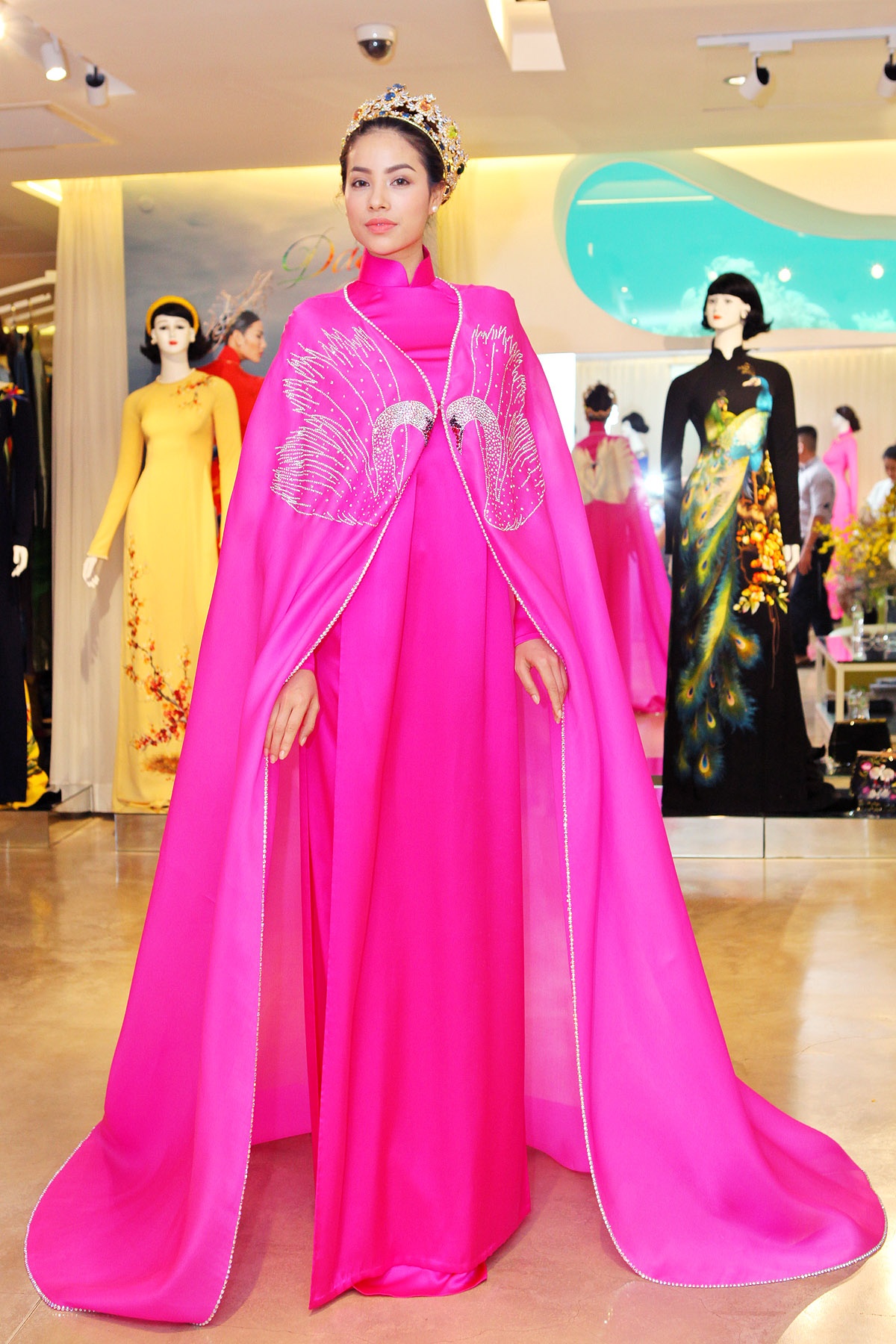 | Trở về từ cuộc thi Hoa hậu Hoàn vũ thế giới 2015, Phạm Hương bận rộn với lịch làm việc dày đặc. Đa sắc là show thời trang đầu tiên có sự góp mặt của người đẹp ở vai trò vedette kể từ khi cô trở lại với công việc. |