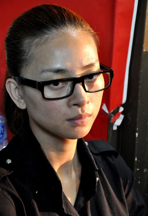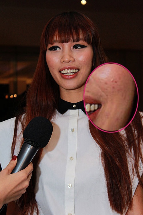 | Mụn trứng cá của Hà Anh nổi rõ trên mặt dù đã trang điểm kĩ. |