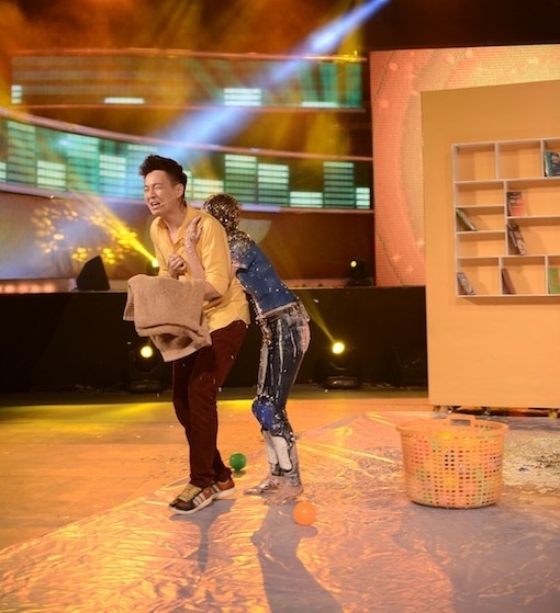 | Minh Khuê trông thật thê thảm khi "trả thù" MC Ngô Kiến Huy trong một thử thách. |